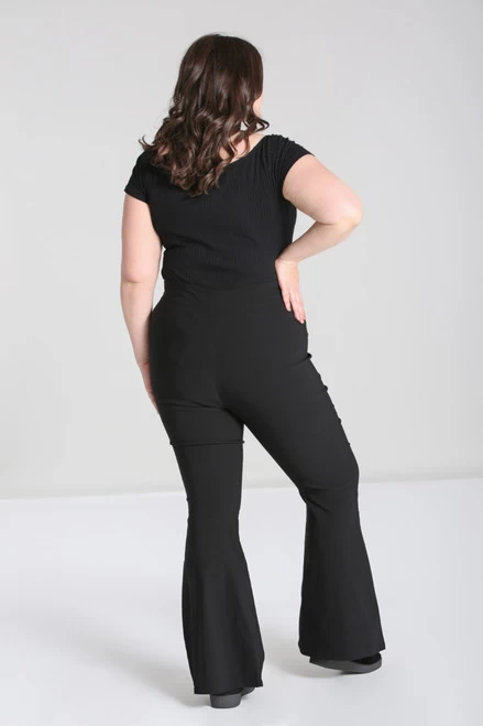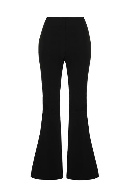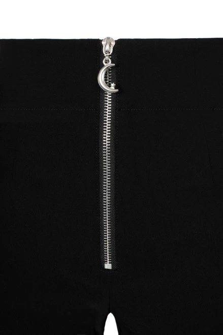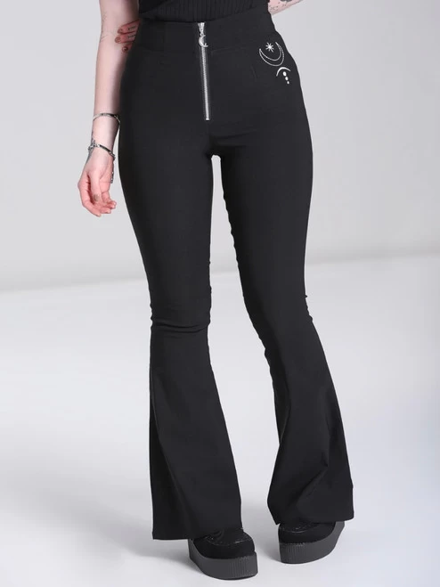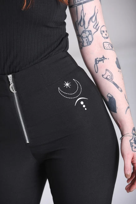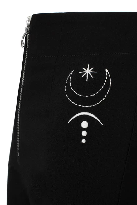 Black stretchy bengaline flares with symbolic eclipse embroidery and crescent moon zipper charm. Salute the moon every day!