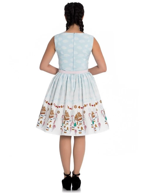 Print is of gingerbread house, gingerbread man, candy cane, lollipop, string of hearts and gingerbread men on a white and pastel blue background consisting of mountains and clouds.