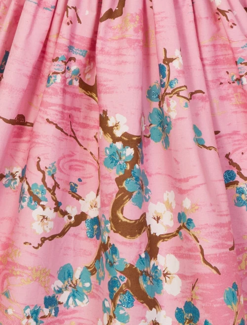 - Print features tree branches with white and blue glittery flowers on a pink background.