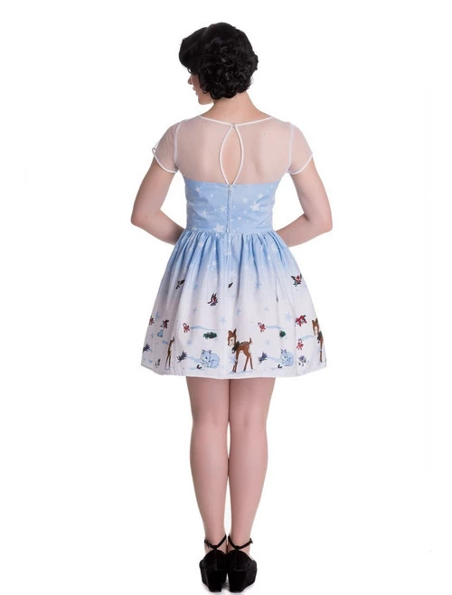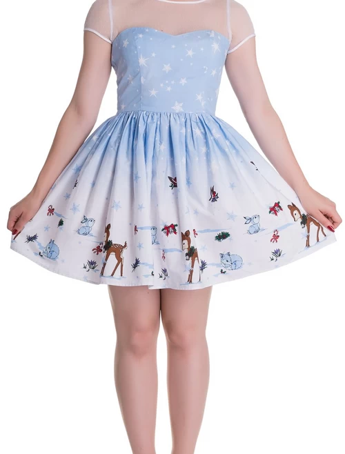 - Print is of snowflakes, winter woodland creatures and Christmas bells on a light blue gradient fading into a white background.
