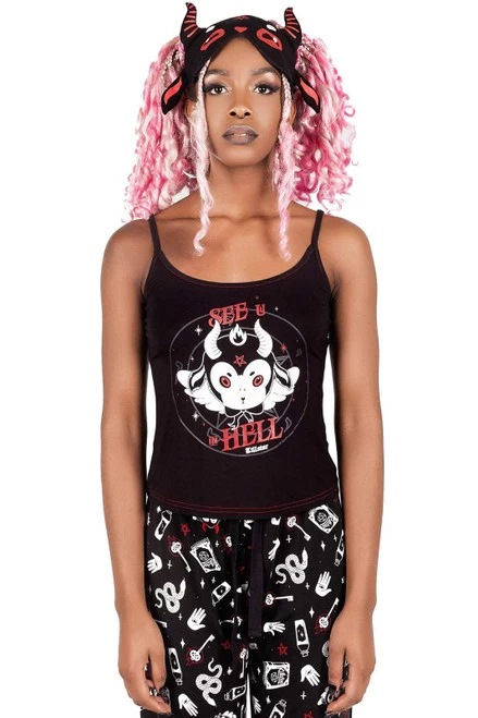 Lounging in yer coffin watchin’ Netflix is the life! The ‘See U In Hell’ sleep cami is perfect for lazy days, sleep-overs, naps and movie-marathons. Made in a stretchy soft fabric for perfect comfort and fit, featuring a contrast print to the front and red stitching and shoulder straps.