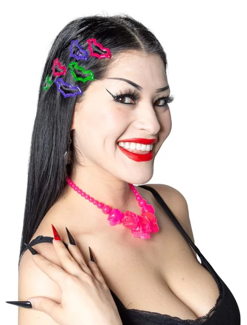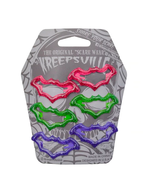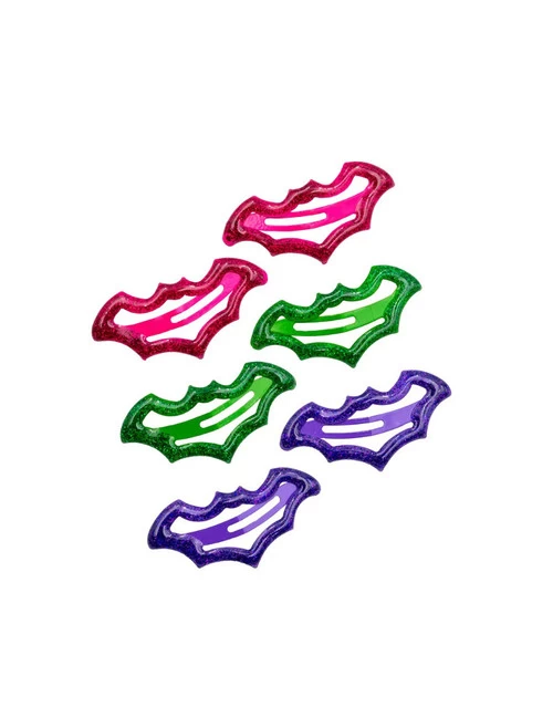 Whether you are a baby bat or a veteran vampire, feel cute and spooky in our bat shaped hair clips! Set of 6 clips in 3 colours: purple, pink and green.