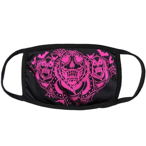 Kreepsville Dia De Los Muertos fabric face covering in pink print on black fabric.
