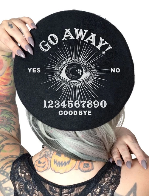 Spin some style with Kreepsville’s beatnik berets! Embroidered planchette motif on front and printed go away design on top.