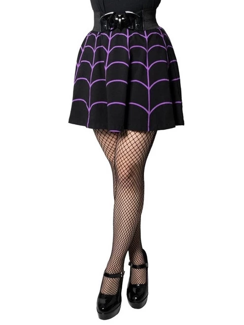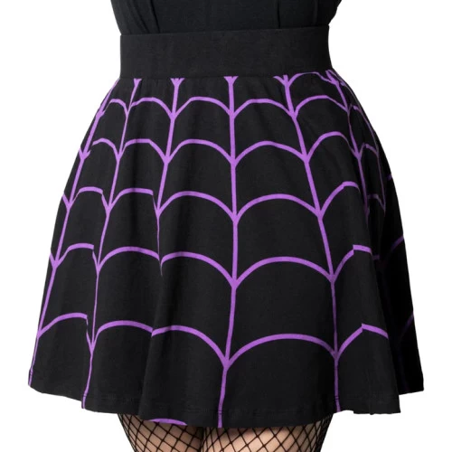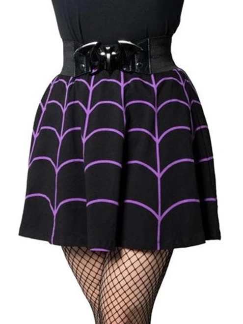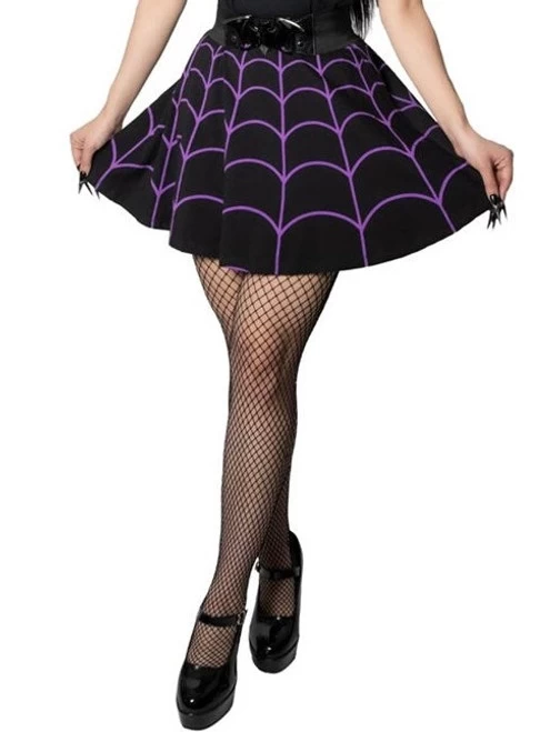 Weave a web of style and turn heads wherever you go with Kreepsville’s Spiderweb Purple Skater Skirt! This skirt features a purple web design all around to express your inner spider-queen. The flattering flared shape with wide elastic waistband make this skirt comfortable and easy to wear for any occasion.
