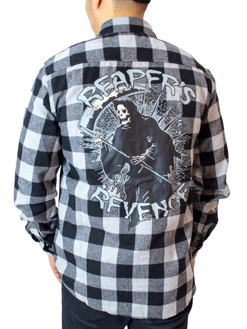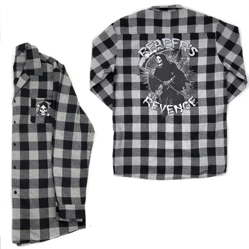 Reapers Revenge Grey Flannel Shirt, grey and black plaid flannel button up with two front pockets and double buttoned sleeves, extra cuff button for roomier cuff!