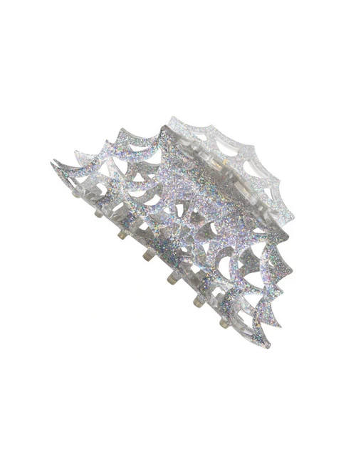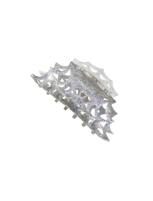 Kreepsville Spiderweb Hair Claw Clip Silver Glitter. Put some scare in your hair with our eye-catching, super sturdy spring claw clips. Perfect for up do’s and lazy hair days!