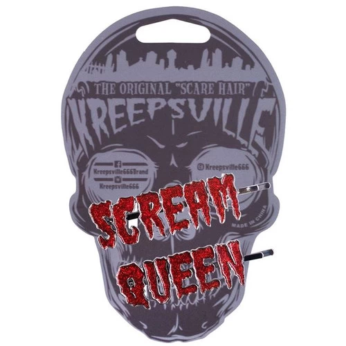 Scream Queen text hair glitter text hair slides. Featuring glitter enamel words on hair slides measuring approximately 2 inches each.