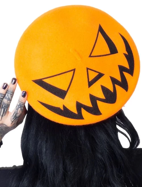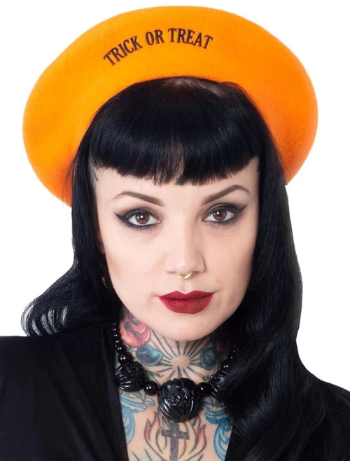 - No tricks only treats this Halloween with Kreepsville’s beatnik berets! In classic pumpkin orange, this beret features black “Trick Or Treat” embroidery on the front and a spooky black Jack-O-Lantern face printed on the top.