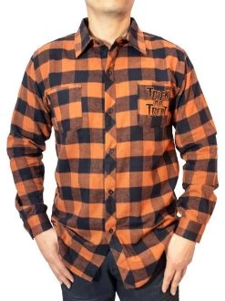 Trick Or Treat Pumpkin Orange Flannel Shirt, orange and black plaid flannel button up with a with two front pockets. The front features “trick or treat” printed on the left pocket and has a jack-o-lantern face print on the back.