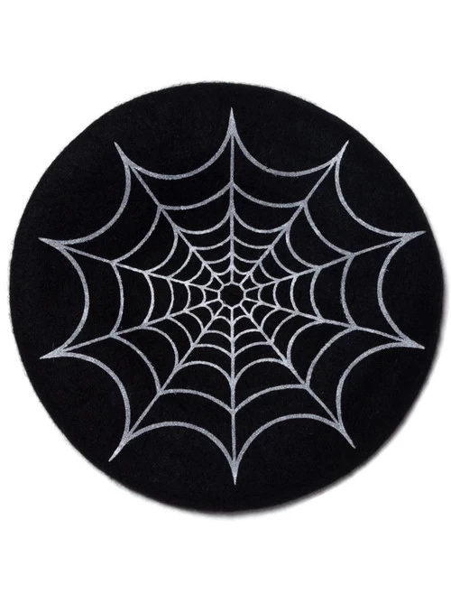 Spin some style with Kreepsville’s beatnik berets! They feature an embroidered spider motif on the front and a printed web on top.