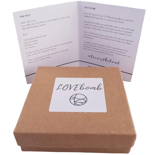 From the heart of Laos, LOVEbomb jewellery is cast from melted bomb fragments, in wood and ash moulds.