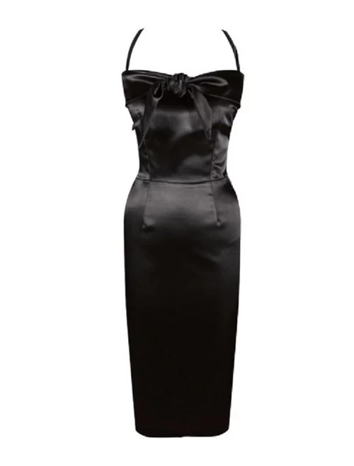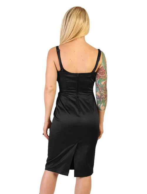 The PUCKER UP dress by Lucky 13 is a classic stretch satin fitted dress with a sexy tie front, and back zipper closure. Perfect for the Holidays or a cocktail party.