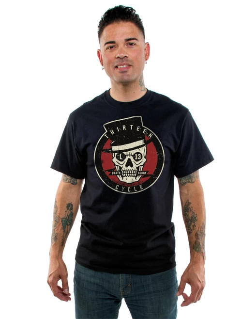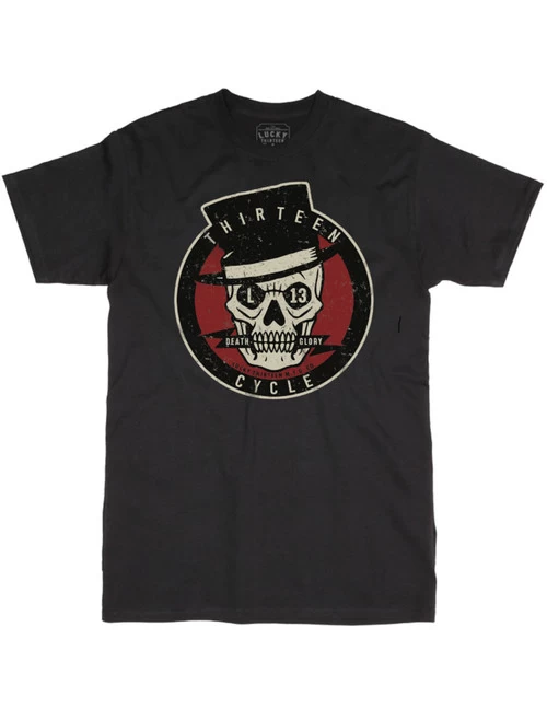 - The 13 CLUB short sleeve men’s tee is made with a 6.1 ounce 100% soft-spun cotton tee with a 1×1 rib knit collar, shoulder to shoulder taping, cover-seamed neck, and double needle sleeves. There is a full front chest print of the “13 Club” motorcycle graphic with a top hat wearing skull biting a bolt of lightning that reads “Death – Glory” along with “Thirteen Cycle” in the outer ring of the circle.