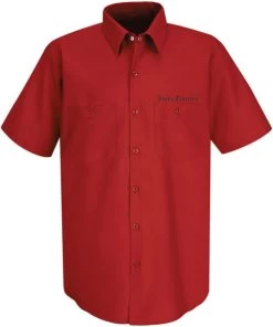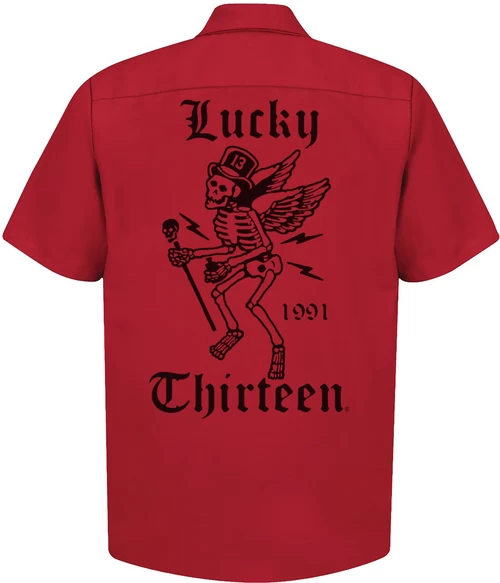 The WINGED SKULLY short sleeve work shirt is a cotton/poly blend fabric with Touchtex technology, which has superior color retention, soil resistance, durable press, and wick-ability. It has a two-piece lined collar with sewn-in stays, six-button front with gripper at the neck. Two button-through, hex-style pockets with a “Lucky Thirteen” embroidery above the left one. There is a full back print of the old school “Winged Skully” design.