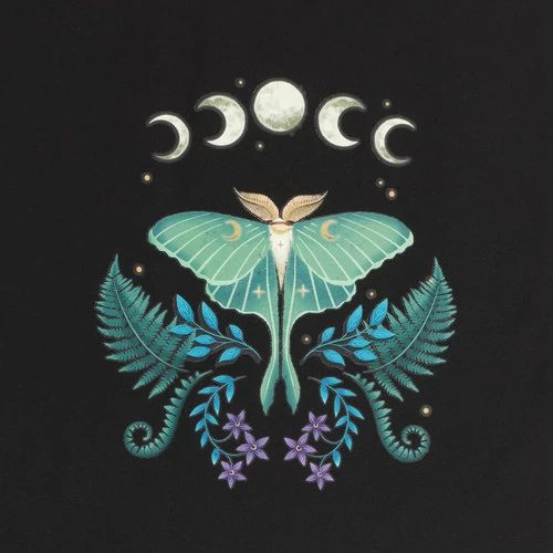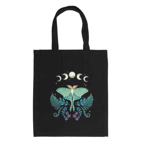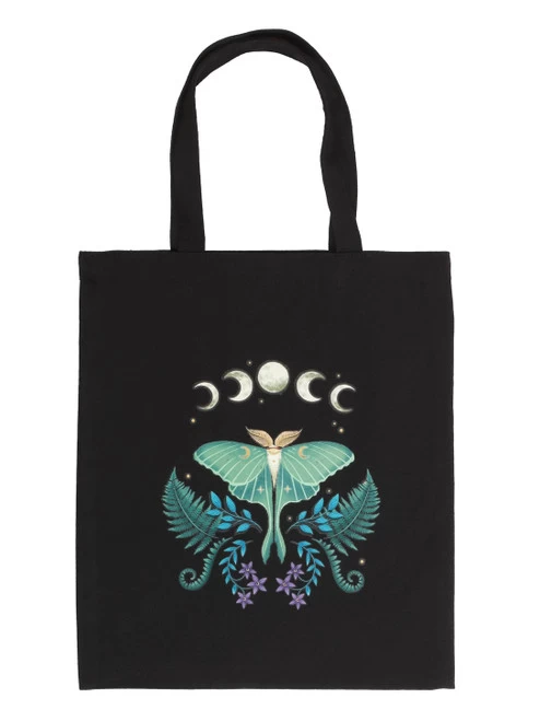 Sustainably carry essentials with this charming tote bag. Featuring a mystical luna moth design on durable, black cotton canvas.