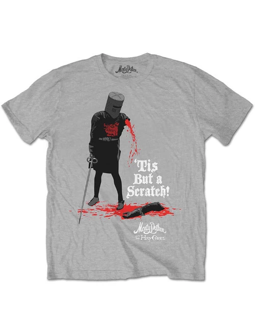 Grey cotton t-shirt featuring a front print of the iconic Black Knight, declaring his severed arm to be “but a scratch”.