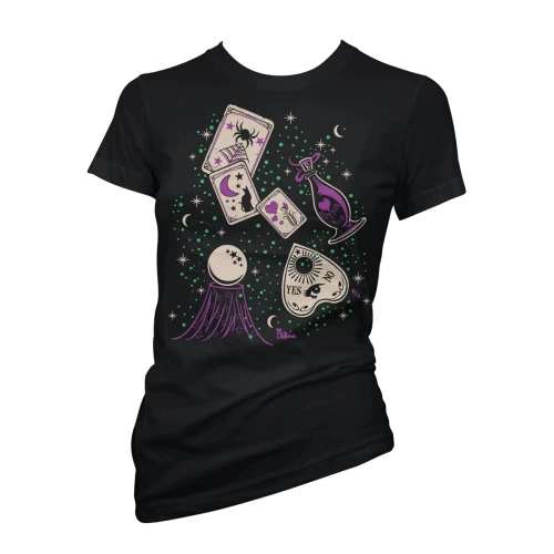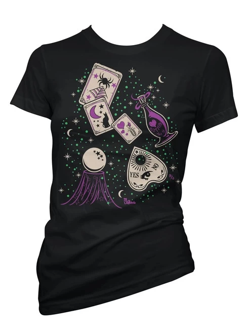Black women’s fit tee featuring original artwork by D.J. Rabiola depicting tarot cards, love potion bottle, crystal ball and talking board planchette.