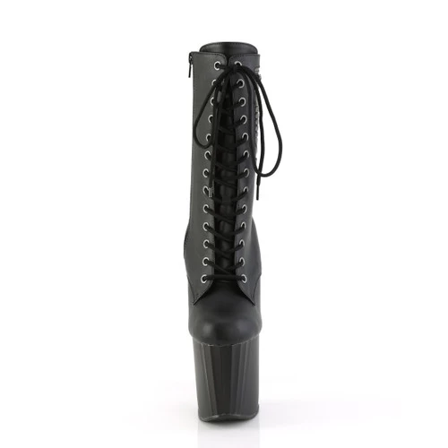8″ (195mm) Heel, 3 3/4″ (95mm) Platform Lace-Up Front Ankle Boot w/Outside Zippered Pocket Featuring Prismatic Linear Design at the Platform Front and Back of Heel, Inner Side Zip Closure