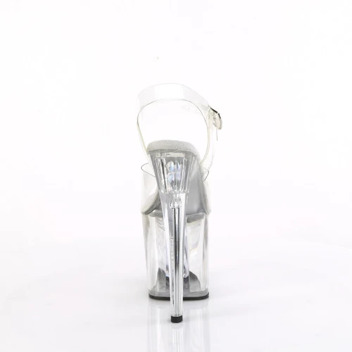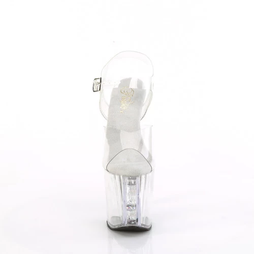 8″ (195mm) Heel, 3 3/4″ (95mm) Platform Ankle Strap Sandal w/Prismatic Linear Design at the Platform Front and Back of Heel Featuring the Platform Bottom Infused with Flowing Liquid & Floating Holographic Glitters, Beads, and Butterflies