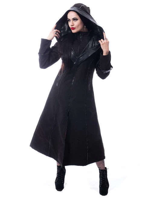 - Black long ladies’ coat featuring faux leather accents around the hood, pockets and seams, as well as buckled straps on the arms and a satin-lined hood. The finishing touch is the ribbon corsetry at the back, with black metal D-rings.