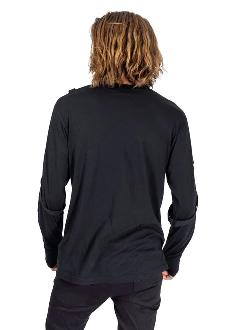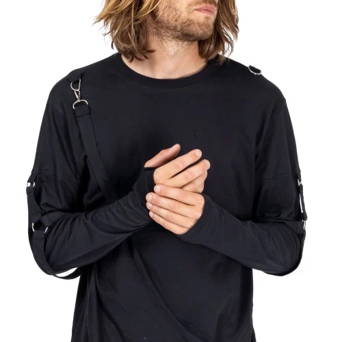 Black long sleeved jersey top with one strap diagonally across the front attached to a D-ring with a carabiner, and straps on the sleeves attached with D-rings and O-rings. The shirt has an uneven overlapped bottom hem for extra grunge.