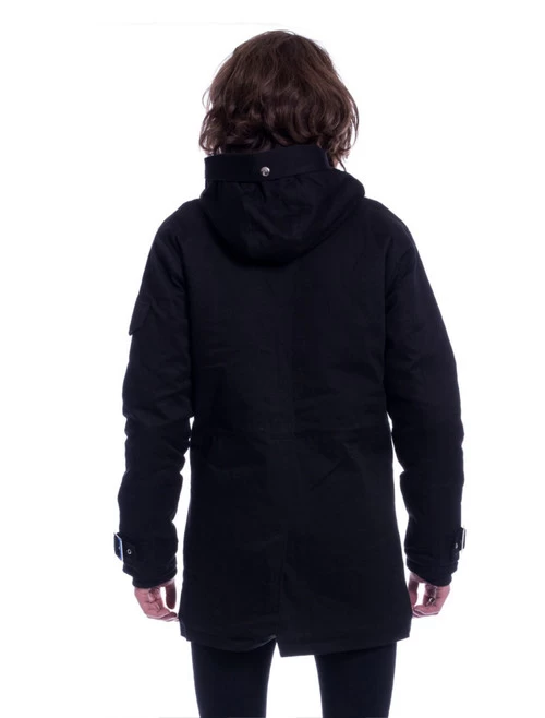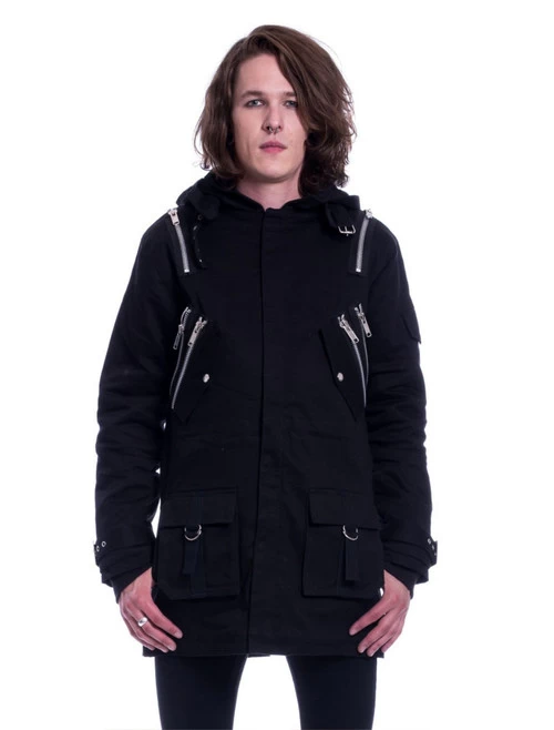 Black, long hooded coat featuring cargo pockets, zipper embellishments and buckled straps at the wrists and collar. The inside is lined with satin and light padding, making it both warm and comfortable.