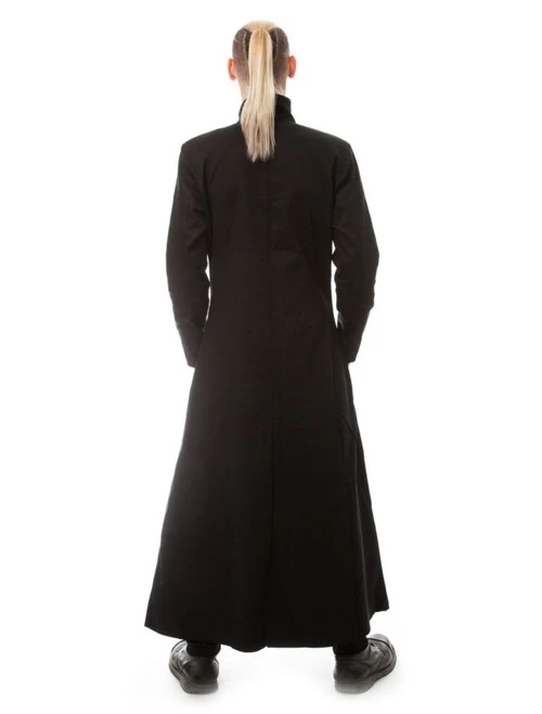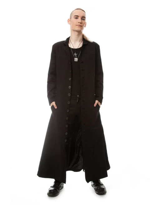 - Long black button up coat with satin lining and pockets in the front.
