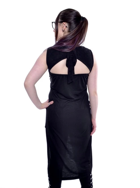 Black sleeveless top with long length at back. There is grommet detaling across the chest, lace tie sides, and and tied up bow across upper back. Perfect over shorts, mini skirts or leggings!