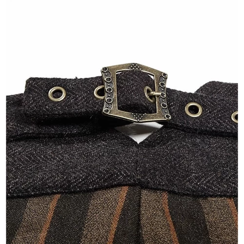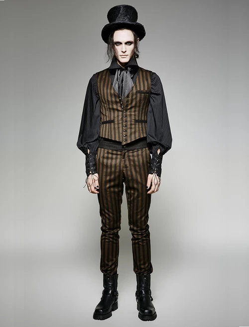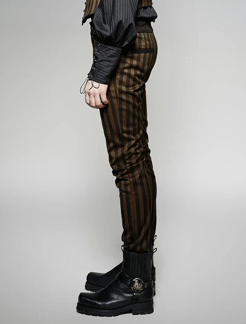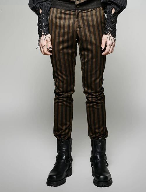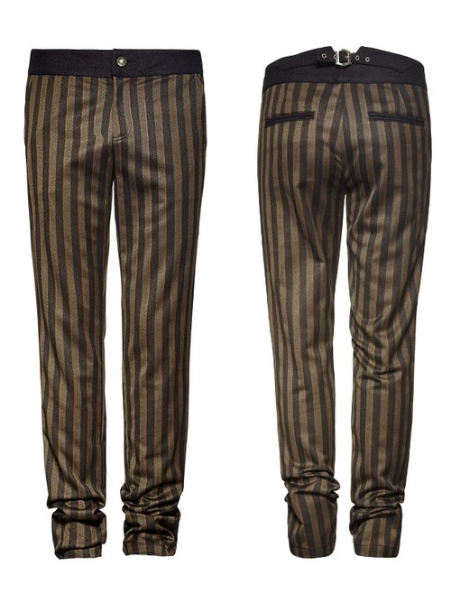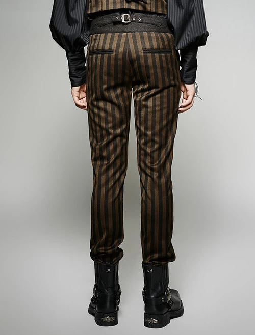 - For the dapper steampunk gentleman, these coffee brown striped trousers have a decidedly old-world feel to them, with a wool-blend top band and adjustable belt at the back. The main fabric is a soft poly-blend that is super comfortable to wear and hangs beautifully.