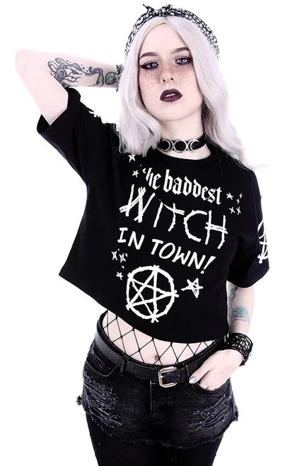 - Perfect to wear with high-waist skirts or jeans, it features prints of “The Baddest Witch in Town” on the front and pentagrams on the sleeves.