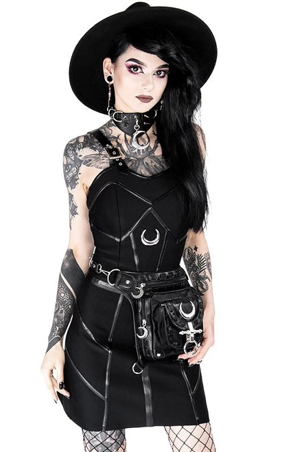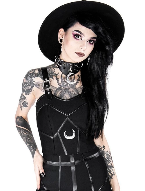 - The top is sewn from a flexible material (95% polyester 5% elastane) with a bandage cut, fitting to the body perfectly. Thanks to the adjustable faux-leather straps you can adjust the length to your needs. Additional artificial leather straps emphasise the bust and optically slim the figure. In the middle there is a metal crescent moon charm. The top hem is trimmed with shiny PU leather to match the accents.