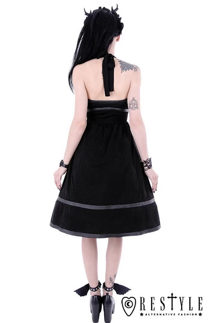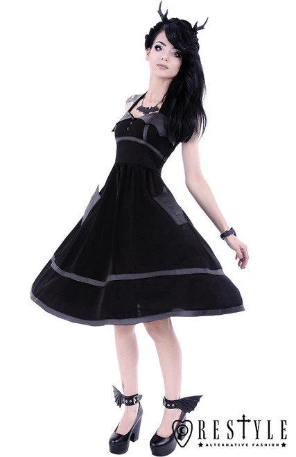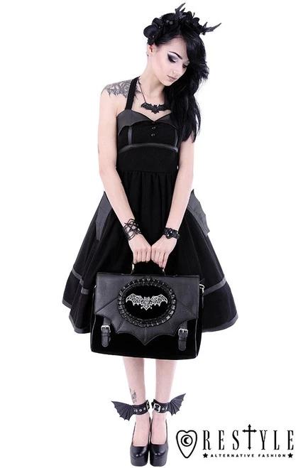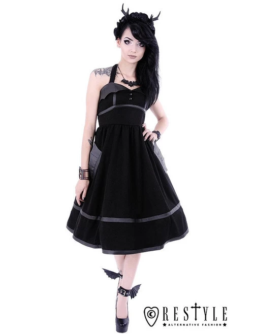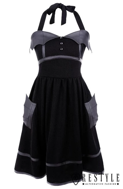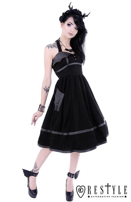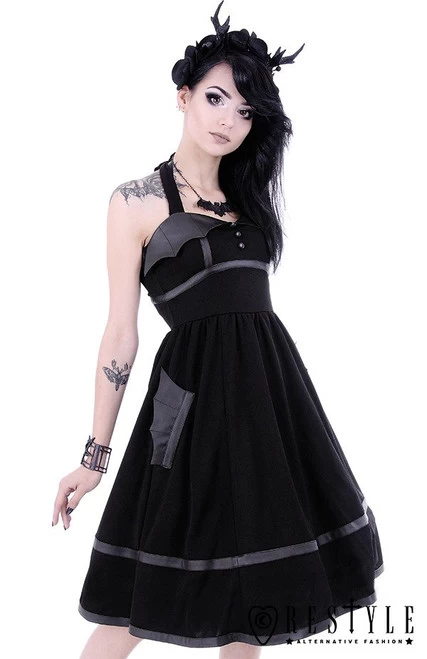 - Rule the night with this darkly-beautiful dress from Restyle! It is made of a solid black material with faux leather bat wings at the collar and pockets, as well as faux leather trim throughout. The dress is fitted at the waist and flares at the belly and hips, giving a nice hourglass shape. The dress fastens on the side and has a halter neck. This dress would be perfect for pin-up girls with a darker edge, or bat lovers in general.