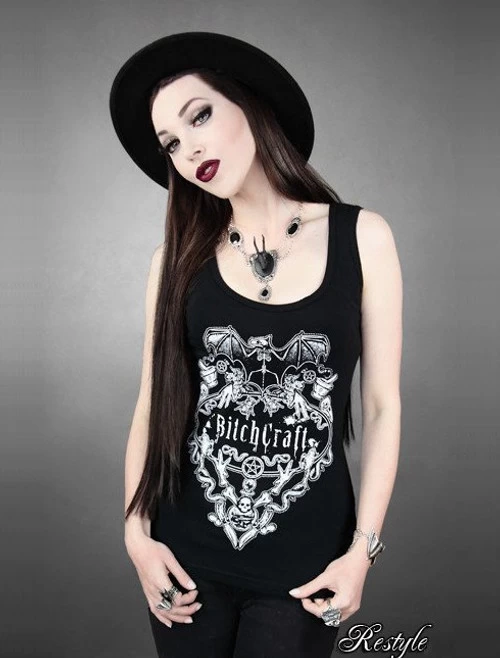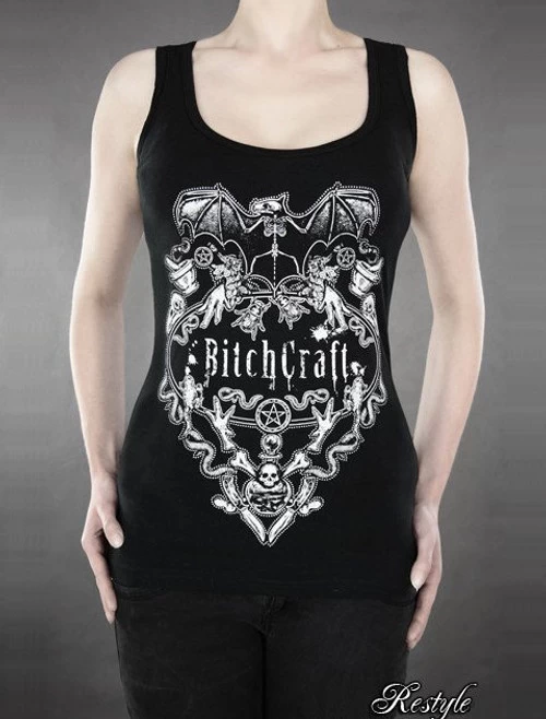- Black tank top made of high-quality, single jersey cotton with 5% elastane, featuring a front print of a skeletal bat-framed “Bitchcraft”.