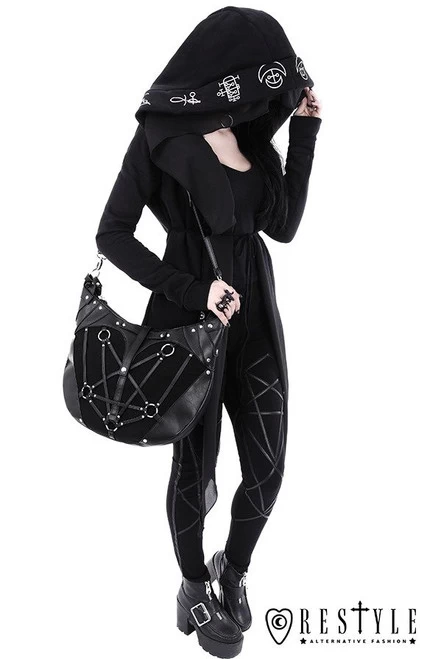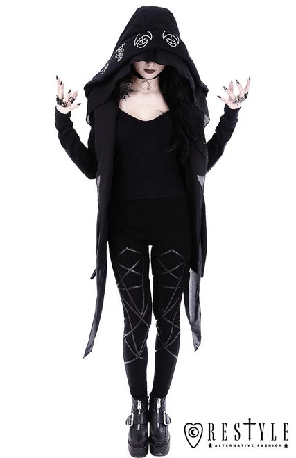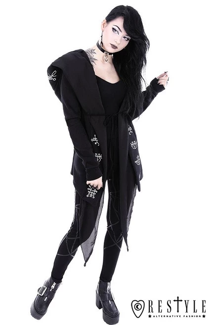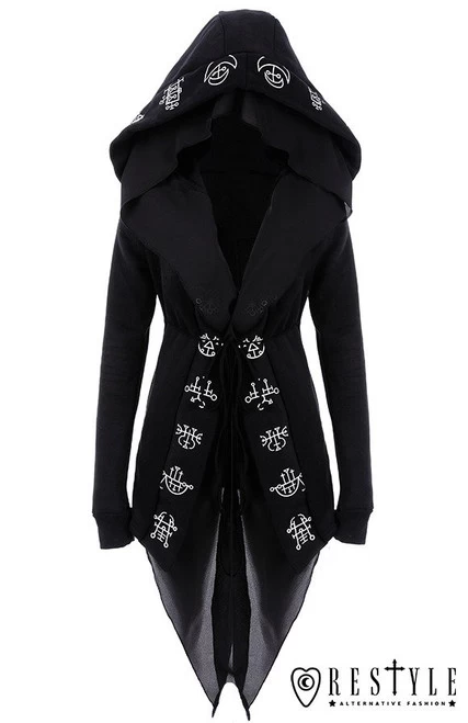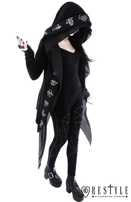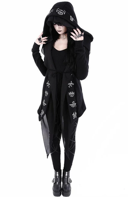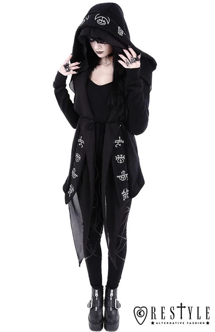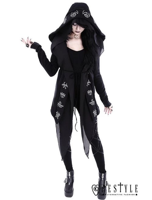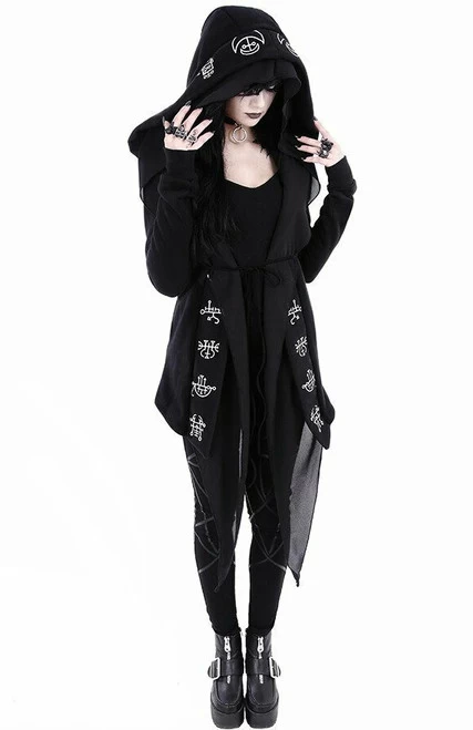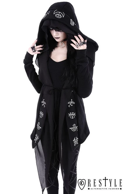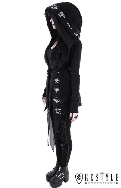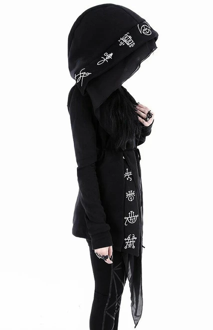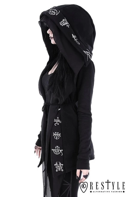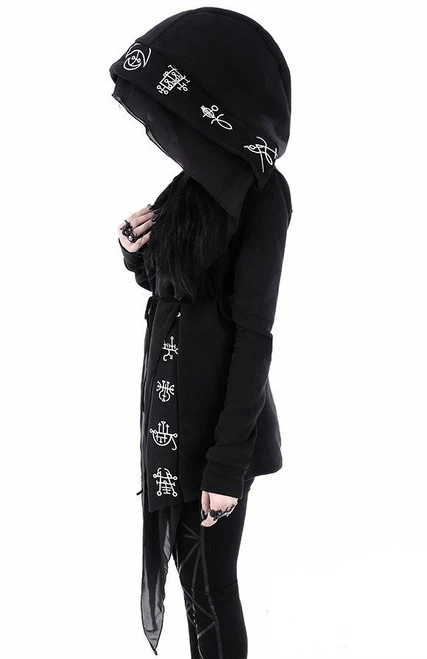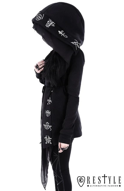 The huge, oversized hood has demon sigils printed on the edge and there are two big hand-pockets on the sides.