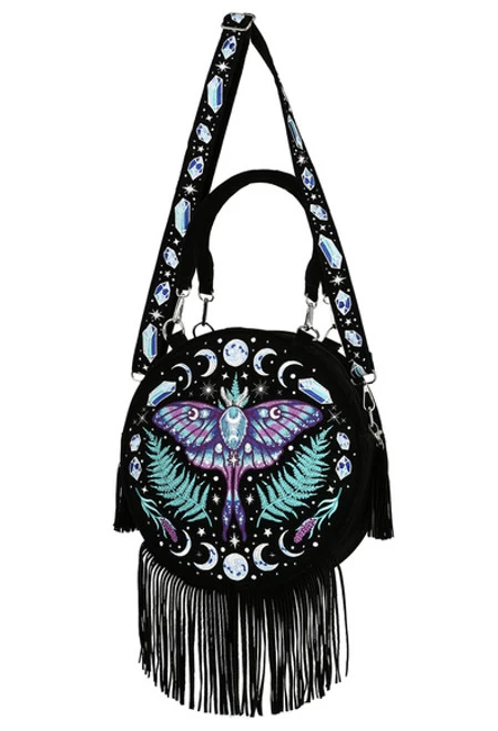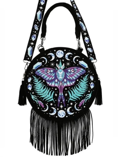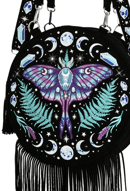The intricate embroidery adorning this round tassel bag radiates with an ethereal brilliance, seeming to dance and swirl in perfect harmony. Its symmetry evokes the flawless order of nature itself. At its heart, a luminous moth appears, as though it has just taken flight from the depths of an enchanted forest, resting gracefully upon delicate fern leaves. Surrounding this central motif, one can find delicate crystal embellishments, moon phases, and stars, all of which draw inspiration from the mesmerizing hues of the Northern Lights, shimmering in shades of turquoise, fuchsia, sapphire, and deep blue…