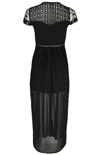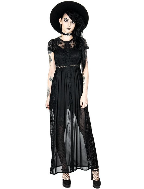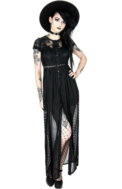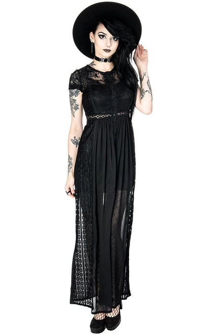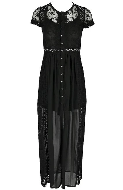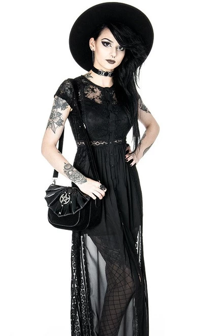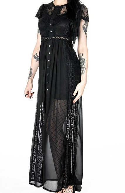 Made of chiffon and solid lace, this dress is perfect for any occasion (not just for goths!). The top and sleeves are decorated with embroidered lace, and the back and sides from a different type of lace. It is fitted at the bust and waist then flares out at the bottom. The front is fastened with