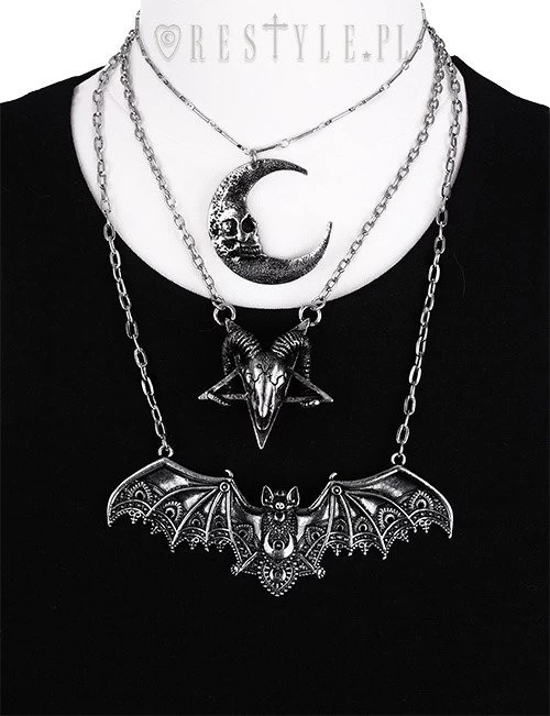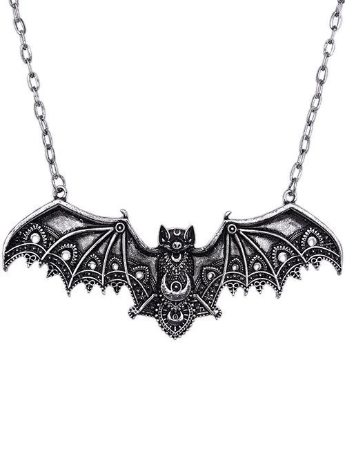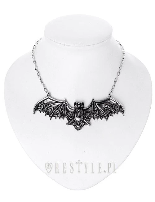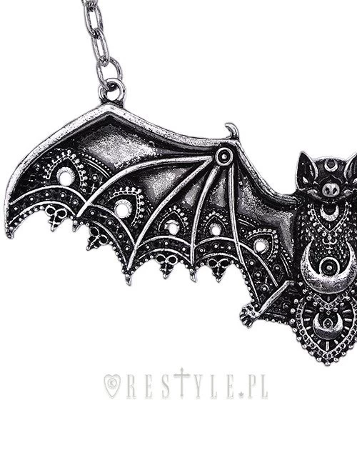 This beautiful pendant is shaped like a bat with his wings outstretched, adorned with lace and alchemical symbols. In the centre of the bat’s chest there is a large crescent moon.