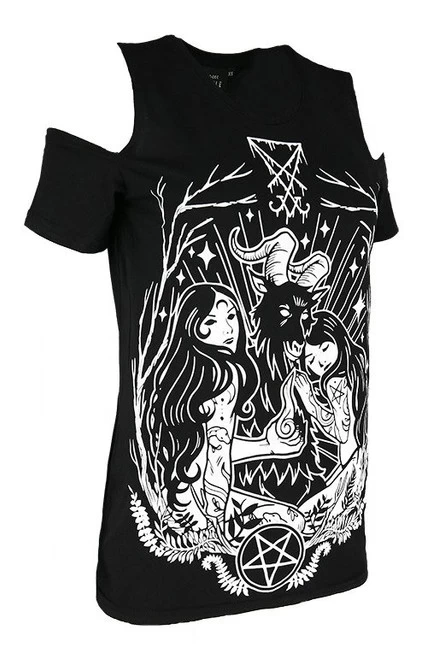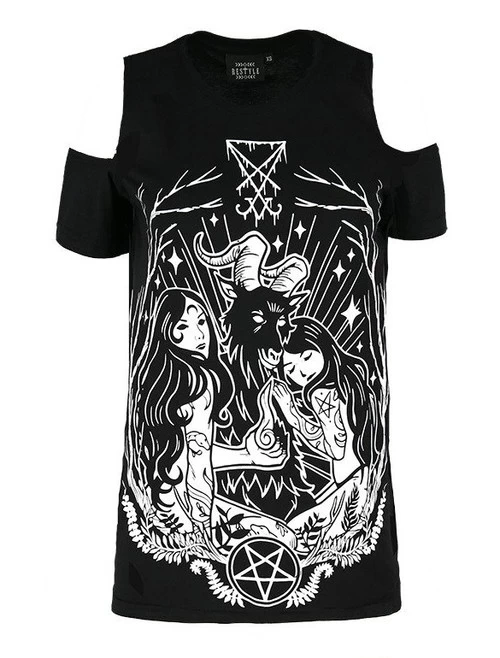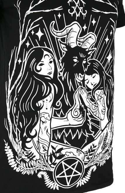 - The Lucifer Oversized T-Shirt from Restyle features a large print of a goat, the symbol of the devil. It is accompanied by two tattooed naked women, one of them tenderly cuddling the goat. The three are surrounded by branches, plants and stars with the Lucifer Sigil emblazoned over their heads.