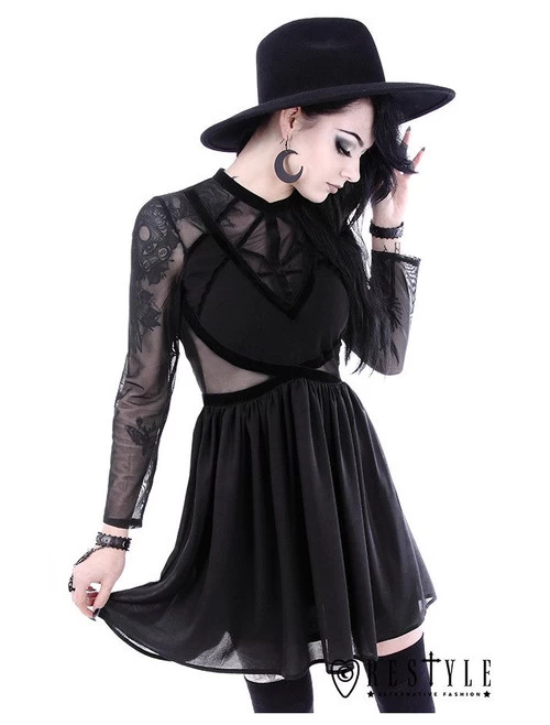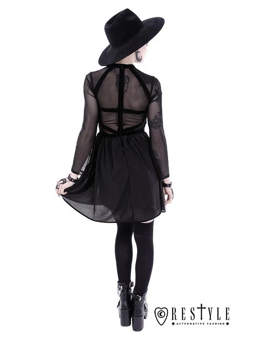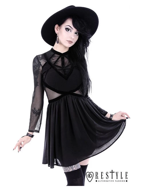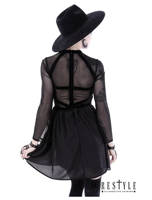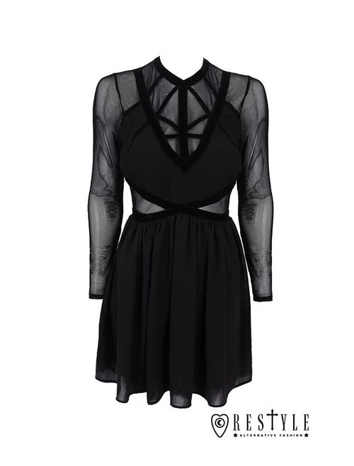 The top part of the dress is decorated with velvet straps which create geometric patterns.