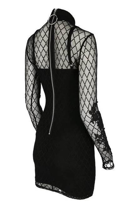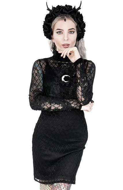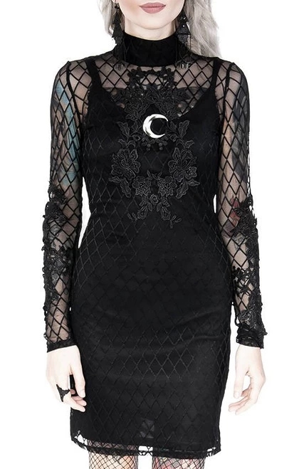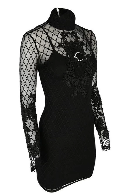 Gothic, tight bodycon dress. It consists of a separate, black petticoat with thin straps and a layer of mesh. The mesh has a diamond motif, it has long sleeves and a mandarin collar. In the middle and on the forearms it is decorated with guipure with a floral motif. In the central point, the dress is decorated with a metal crescent. Lace is non-itchy and crease-resistant.