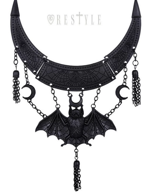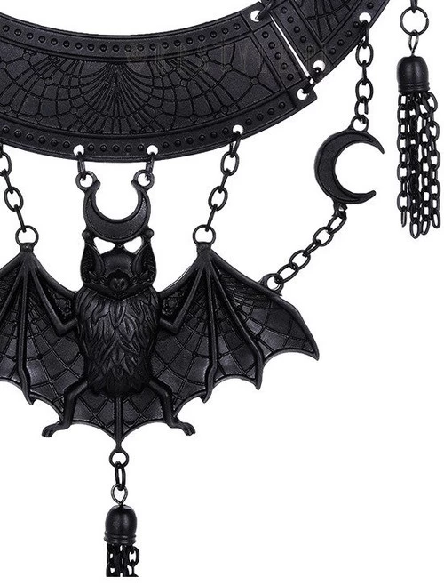 Oriental necklace made of three parts; a gothic bat, crescent moons and tassels made of small links of chain. This statement necklace will make any outfit instantly more sophisticated!
