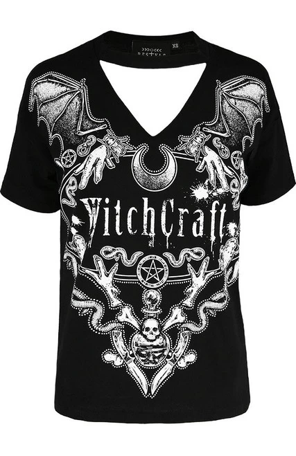 T-shirt has choker on neck, perfect for every respected witch in town.