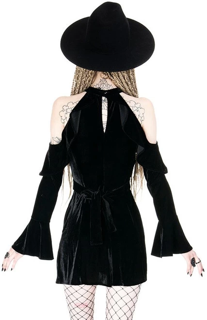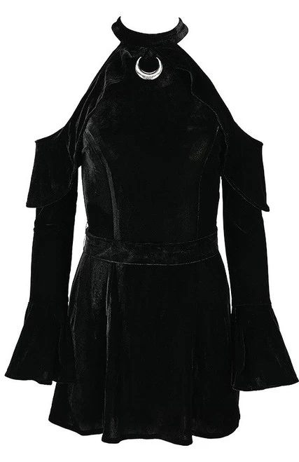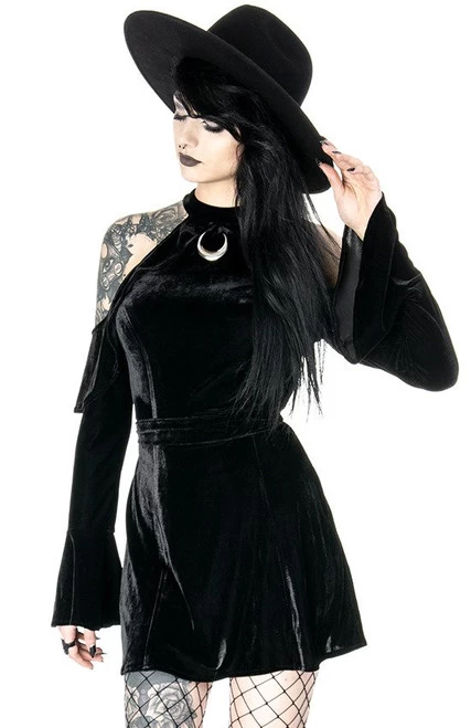The Velvet Moon Dress is made of a very soft black velvet, fitted to emphasise the feminine silhouette. In addition to the metal moon charm on the front, it features long sleeves that flare at the cuff, with cold shoulders trimmed with frills. It fastens with a button at the back of the neck and self-fabric tie at the waist. It is the perfect choice for every witch; just add a witchy hat and handbag and you’re ready for sabbath!