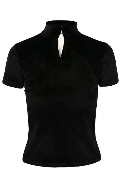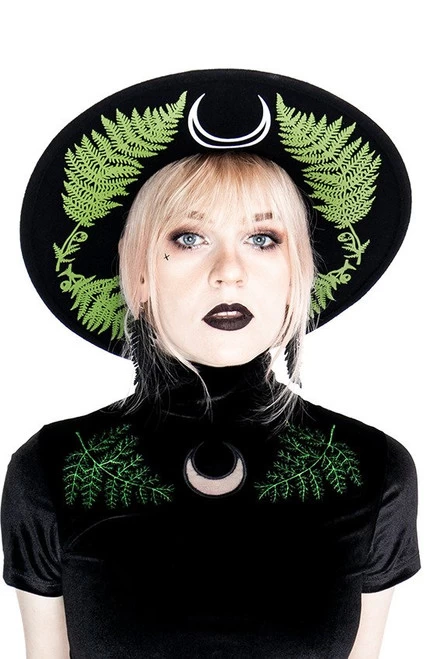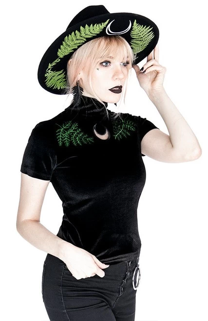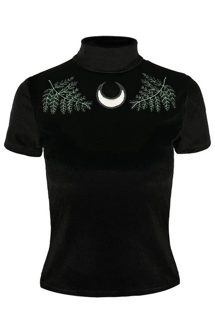 - Made in Poland from stretchy, soft velvet, this well-fitted, classic design features two buttons on the back and detailed embroidery of fern leaves with a mesh cut out of a crescent moon.