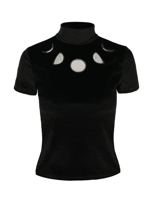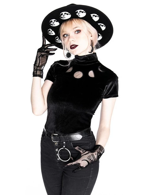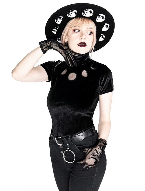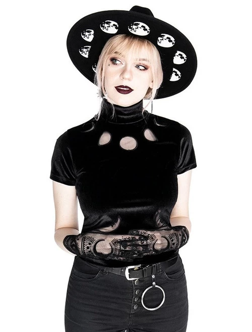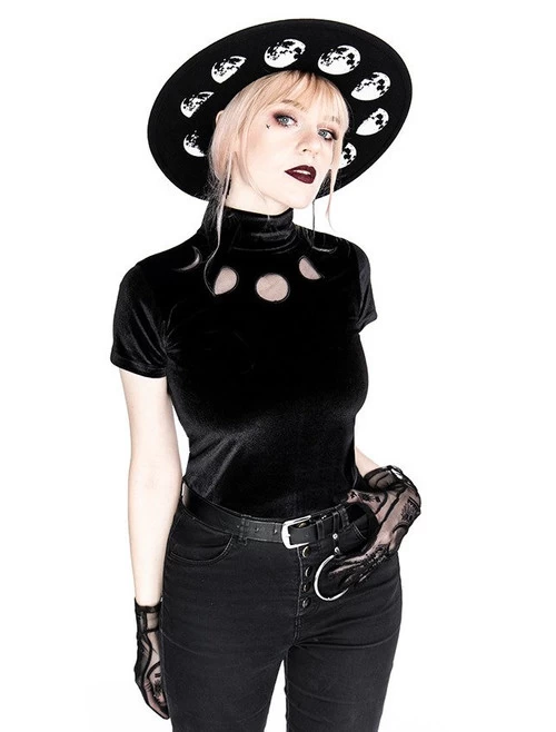 Made in Poland from stretchy, soft velvet, this well-fitted, classic design features a high non-restrictive collar and two buttons on the back. The bust is decorated with cut outs of moon phases, made of mesh.