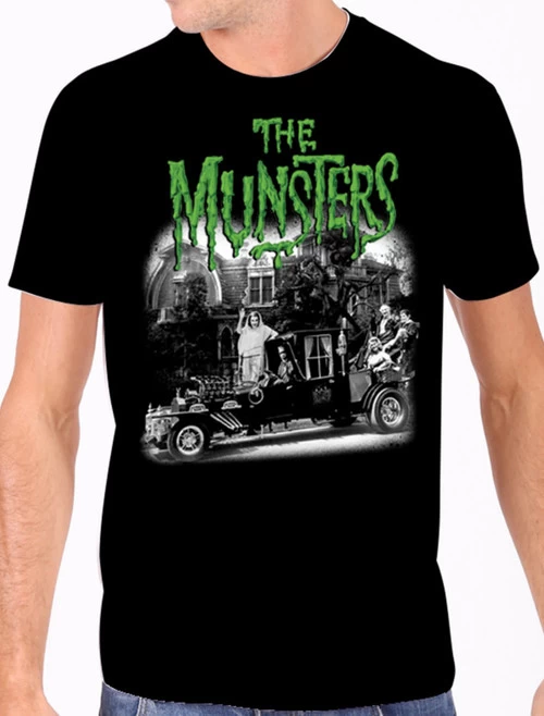 Officially licensed for Rock Rebel by Universal, this tee features the Munsters next to the family car, on a men’s graphic t-shirt. High quality print on a sturdy yet breathable fitted black shirt.