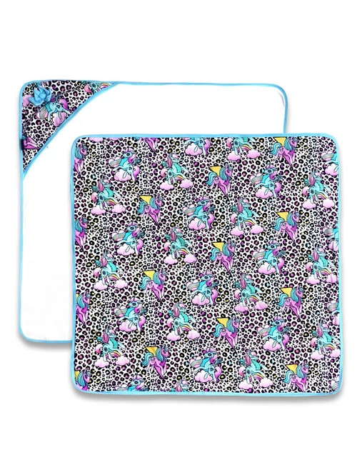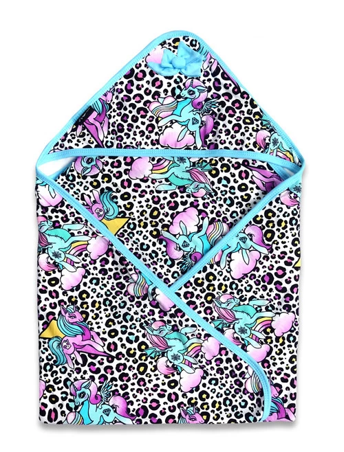 For your cute little burrito, this baby blanket features an allover print of leopard spots, unicorns and rainbows.