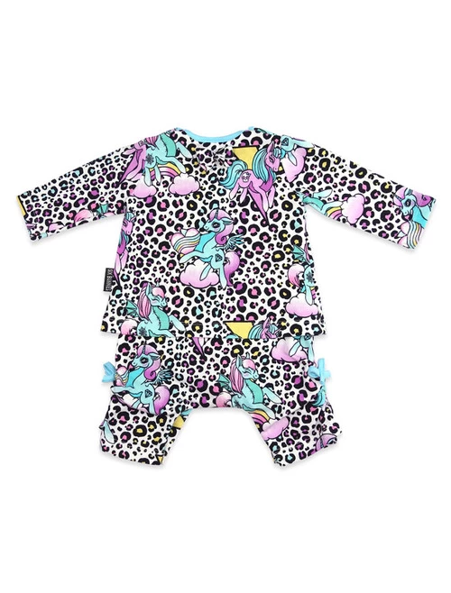 Super cute baby bodysuit with a little bow decoration on the back, made to look like a t-shirt and pants. Features and allover print of leopard spots, unicorns and rainbows.