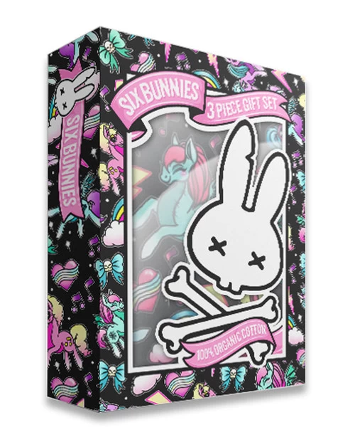 Baby gift box set comprising of 1 romper, 1 bib and 1 beanie with an all-over print of cute little unicorns, love hearts, music notes, lightning bolts and more!